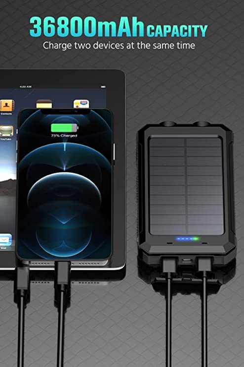 Solar-Charger-Power-Bank – Cargador portátil de 36800 mAh, QC3.0 Cargador rápido Puerto USB dual Linterna LED incorporada y brújula para todos los teléfonos celulares y dispositivos electrónicos (Negro). El banco de energía tiene una capacidad de celda grande de 36800 mAh. El uso de celdas de polímero de litio de alta densidad líderes en la industria lo hace más compacto y tiene una mayor capacidad. Una batería de alta calidad y alta densidad puede soportar miles de ciclos de carga.